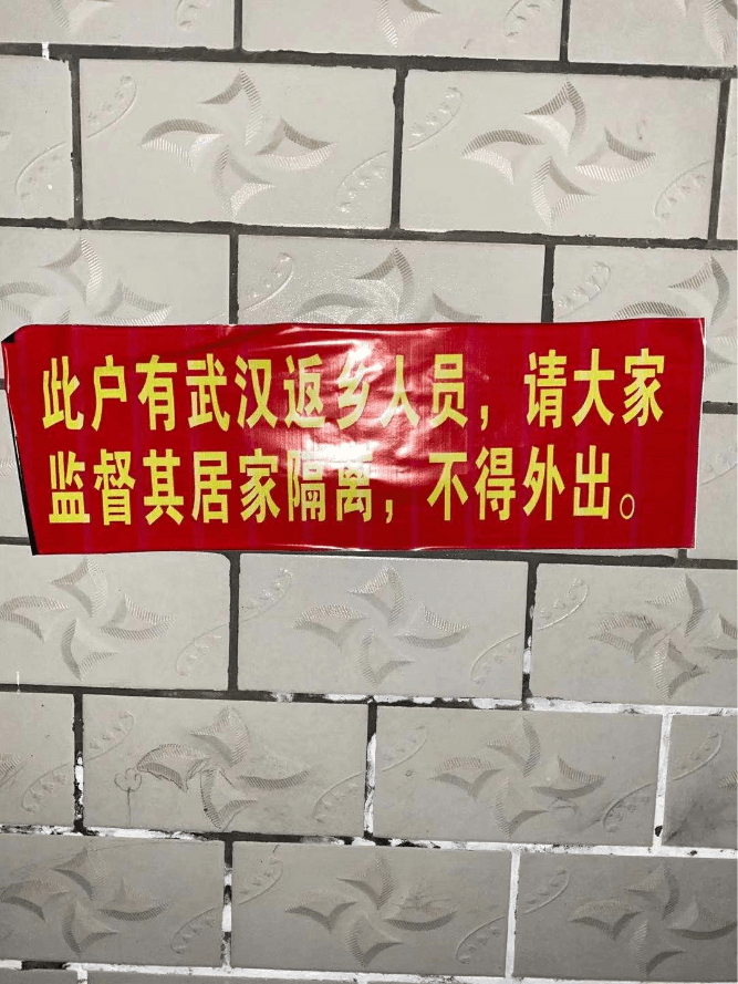 大概2-3小时就到家了(家在湖北省境内)。在家,我也没敢取下口罩(除了睡觉取下来)。一边从网上了解最新疫情,一边给家人做着思想工作,给他们灌输“疫情有多可怕”的思想,希望身边的人都能重视起来,减少接触。当时我这个小乡镇也时有传出有人感染被隔离的消息,并且乡镇、村政府开始封路,每家每户都拉了隔离带,严禁出门。我家还被贴了告示。见下图: