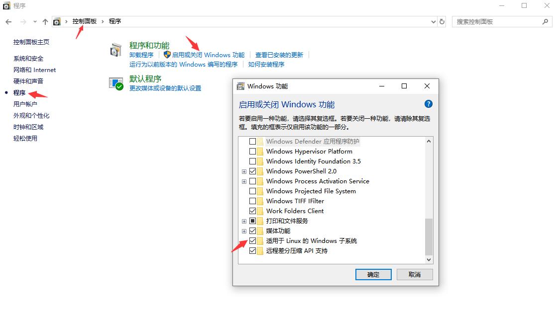 1.先进入“控制面板”=>“程序”=>“启用或关闭Windows功能”=>找到“适用于Linux的Windows子系统”=>选中(前面打勾)=>确定, 然后重启电脑。